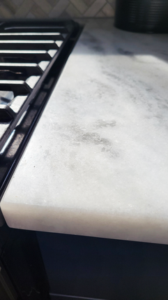 1. Calacatta Herringbone Marble Mosaic clads the backsplast wall. 2. A singular pendant dileniates the dining area. 3. Brushed Silver finishes on the cabinetry. 4. Inch-and-a-half Granite Countertops complete the kitchen's contemporary look.