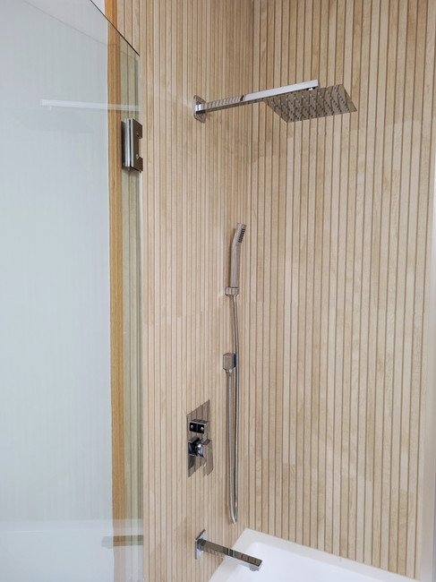 Another significant transformation in this project was the bathroom in the guest suite. We updated the original layout, creating straighter lines, which enhanced the space's effectiveness and efficiency and we finished the space with matte black fixtures and hardware.
